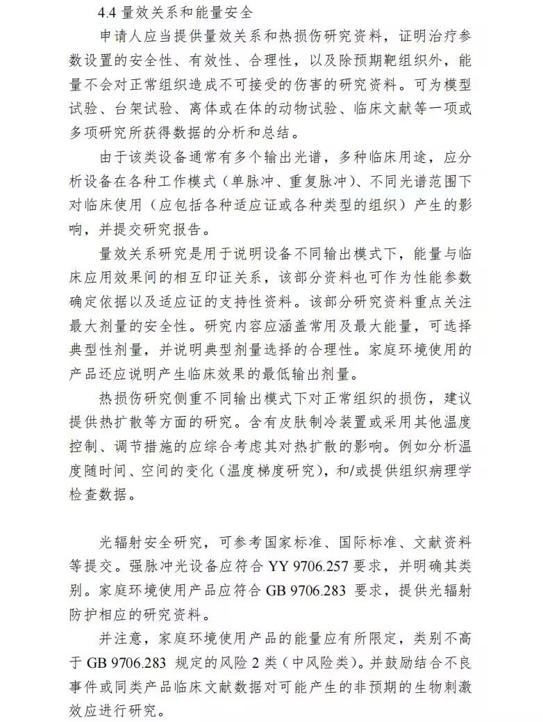 同時根據(jù)《強脈沖光治療設(shè)備注冊審查指導原則(2023年修訂版)》的第4部分研究資料中的4.4量效關(guān)系和能量安全章節(jié)提出:申請人應(yīng)當提供量效關(guān)系和熱損傷研究資料,證明治療參數(shù)設(shè)置的安全性、有效性、合理性。由于該類設(shè)備通常有多個輸出光譜,多種臨床用途,應(yīng)分析設(shè)備在各種工作模式(單脈沖、重復脈沖)、不同光譜范圍下對臨床使用(應(yīng)包括各種適應(yīng)證或各種類型的組織)產(chǎn)生的影響,并提交研究報告,以及除預期靶組織外,能量不會對正常組織造成不可接受的傷害的研究資料。